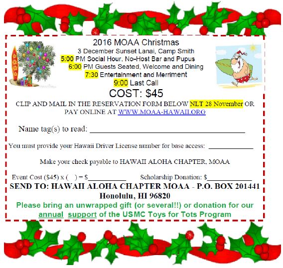 December, MOAA Christmas Party. It’s the same beautiful venue as last year, the Sunset Lanai at Camp Smith, with social hour and pupu at 5:00 PM and dinner at 6:00